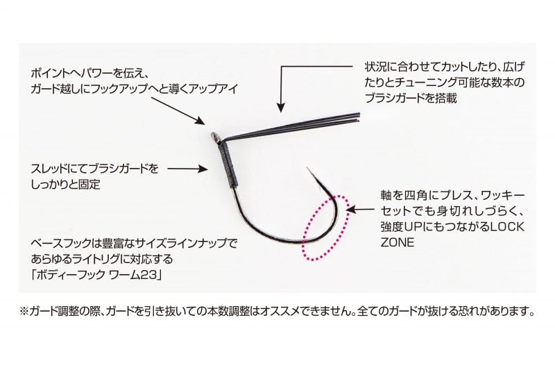 Providing easy access into heavy cover where the big ones lurk, the Decoy Worm108 Body Guard HD Weedless Wacky Hook is a strong, fine gauge, wide gap finesse hook perfect for wacky and neko rigging. Equipped with four relatively stiff plastic weed guard fibers, anglers can easily adjust the guard power by trimming or fanning out the fibers to match the cover or improve hook-up ratios. Forged with an up-tuned eyelet and Decoy’s unique Lock Zone bend, the Decoy Worm108 Body Guard HD Weedless Wacky Hook keeps bulky stick worms in an upright and ideal striking position.