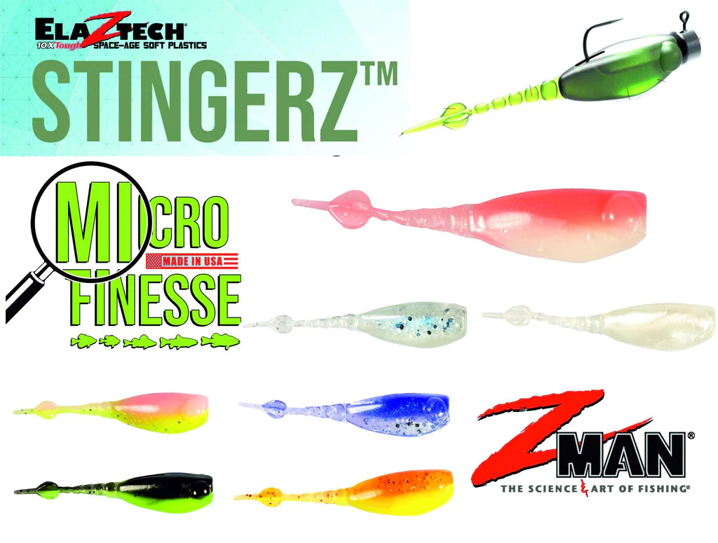 An exclusive Z-Man bait shape, the 2-inch StingerZ features a unique segmented, straight tail shad profile. A thick, shad/baby panfish body sculpt features a convenient hook slot for easy rigging. Segmented tail undulates and quivers continuously, activated by a bulbous stinger. The buoyancy and durability of the ElaZtech material also makes the bait ideal for the dock shooting technique. Pairs seamlessly with Micro Finesse ShroomZ jigheads and fishes ideally while cast and retrieved horizontally or below a bobber/float rig, tail hovering and waving seductively. Tough ElaZtech also resists tail bite-offs from nuisance fish. Ten colors include popular crappie and panfish patterns.