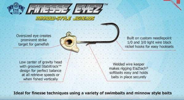 The preeminent finesse jighead for systematic finesse, swimbait and soft jerkbait fishing, the Finesse EyeZ Jighead calls on a low-center-of-gravity head with Z-Man's grooved Stabiltrack™ design to maintain perfect balance at all retrieve speeds, or when fished vertically. Oversized 3D eyeballs highlight four jig color patterns, focusing predatory attention and creating a pronounced strike target.
